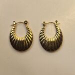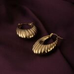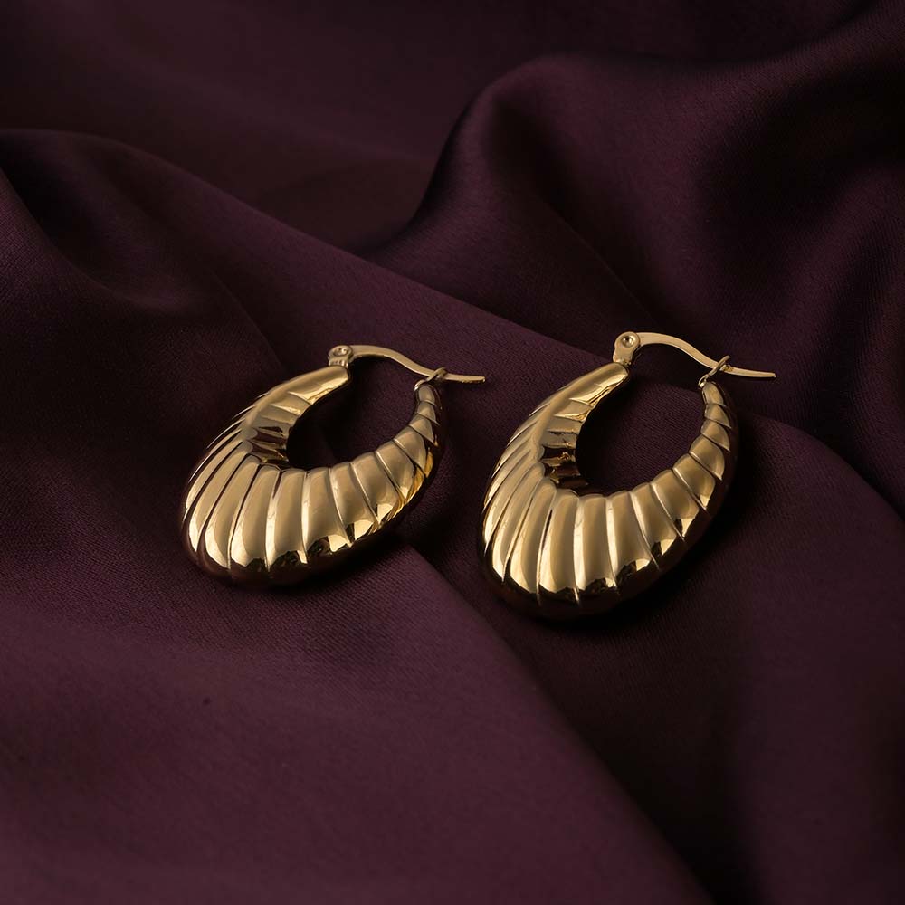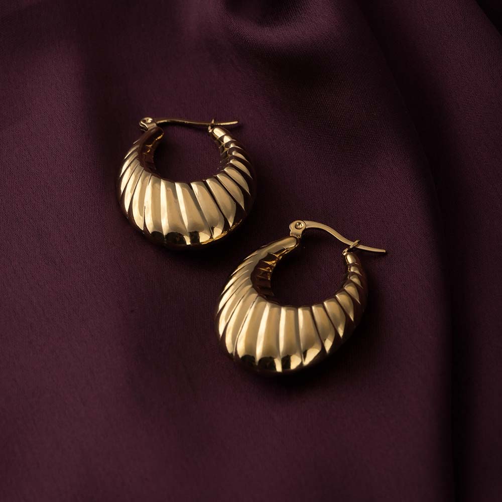 - Features a striking gold-toned, chunky hoop design with a prominent ridged surface.