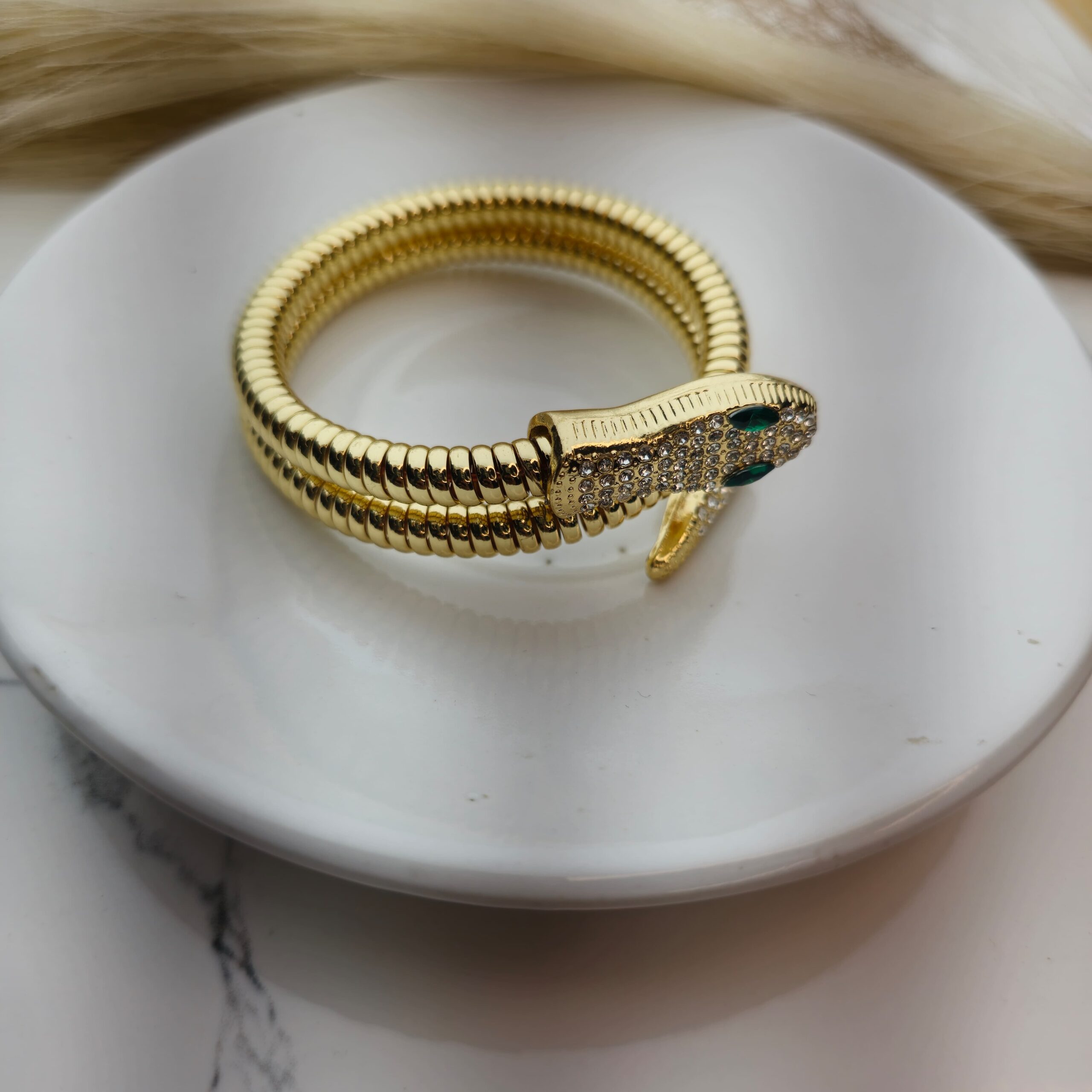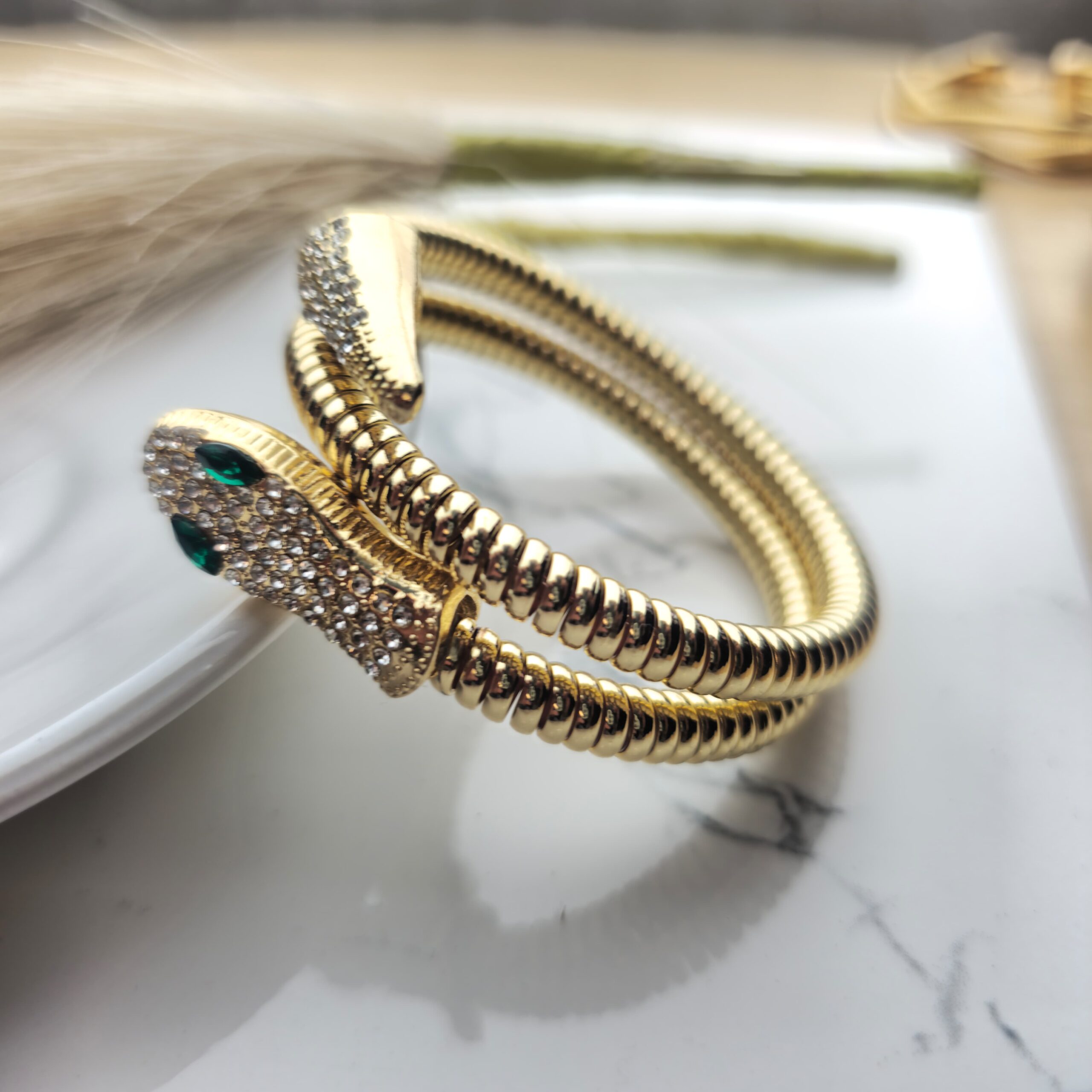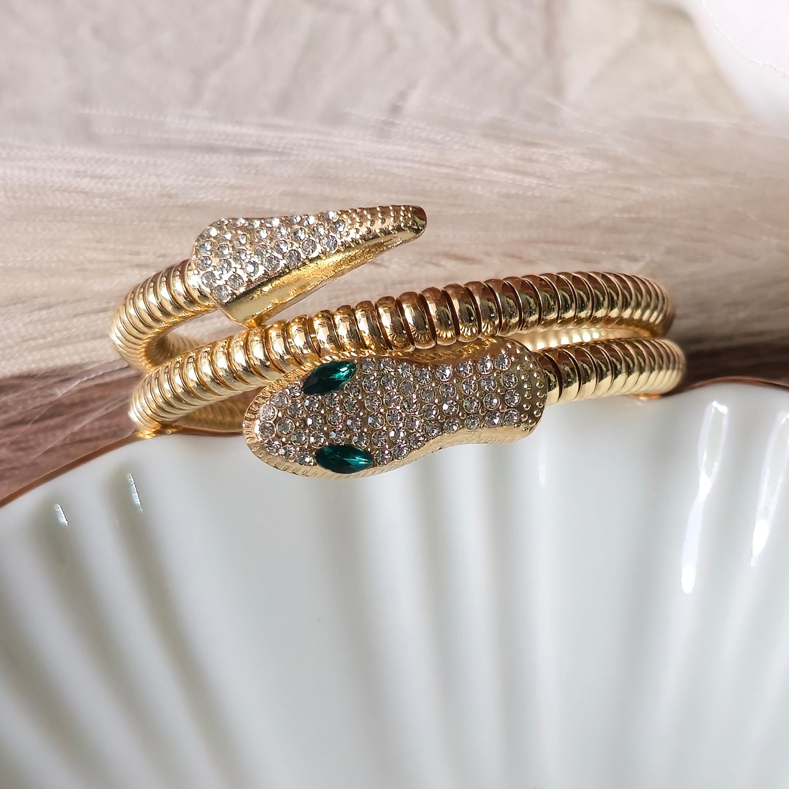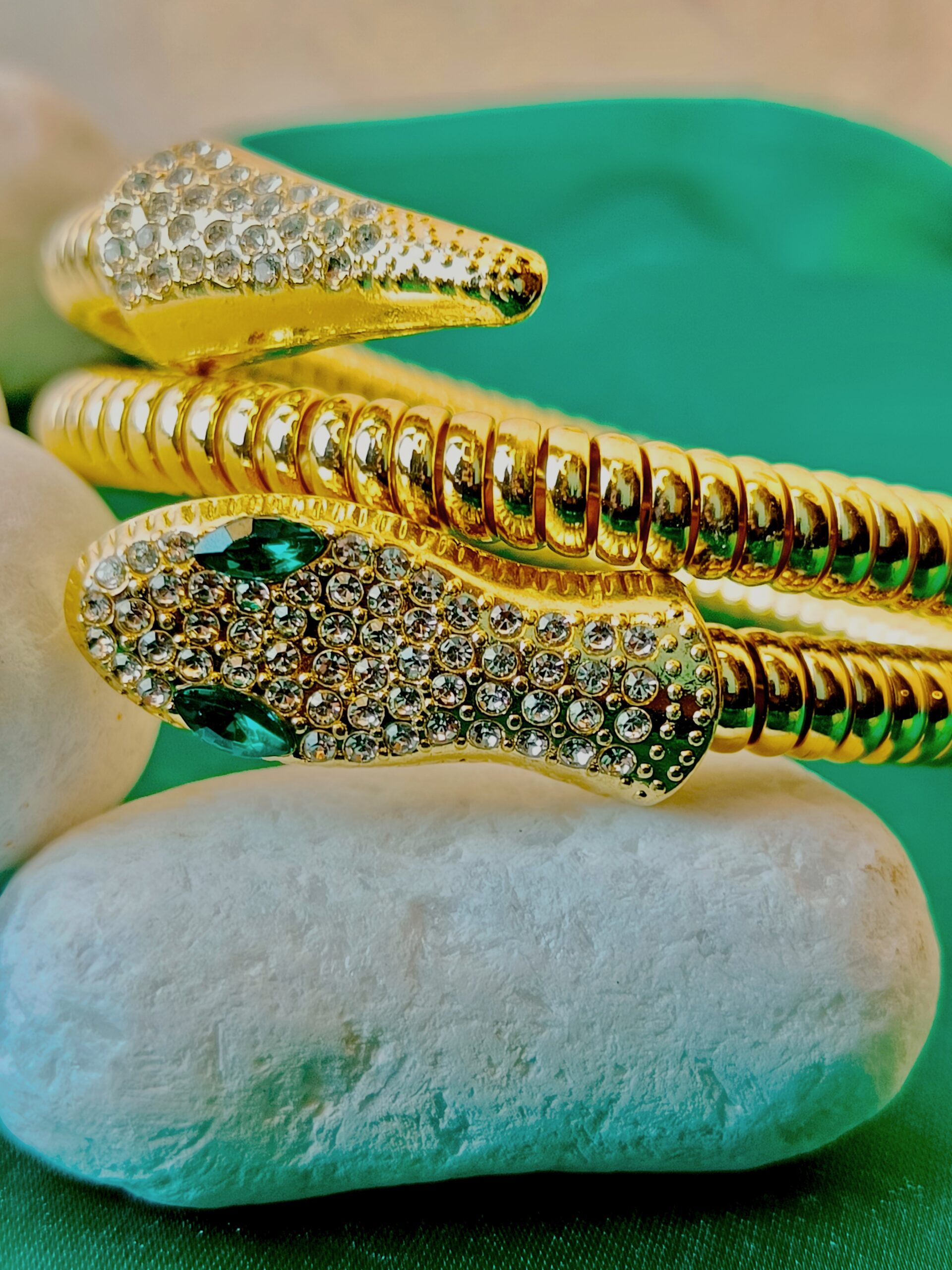 This is a gold-toned snake bracelet that coils around the wrist. It features:
