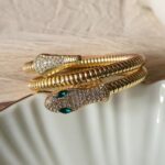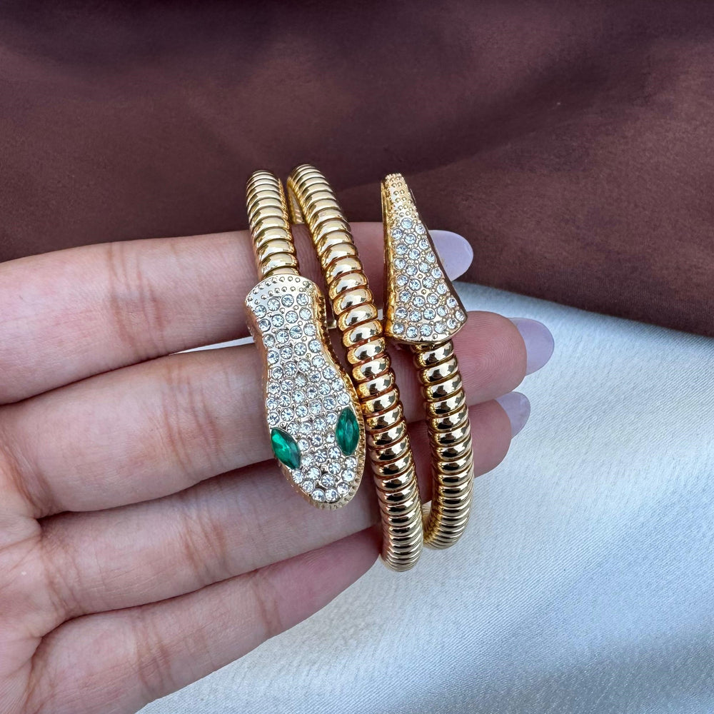 - A detailed snake head with green stones for the eyes and clear crystals or rhinestones pavé-set on the head.