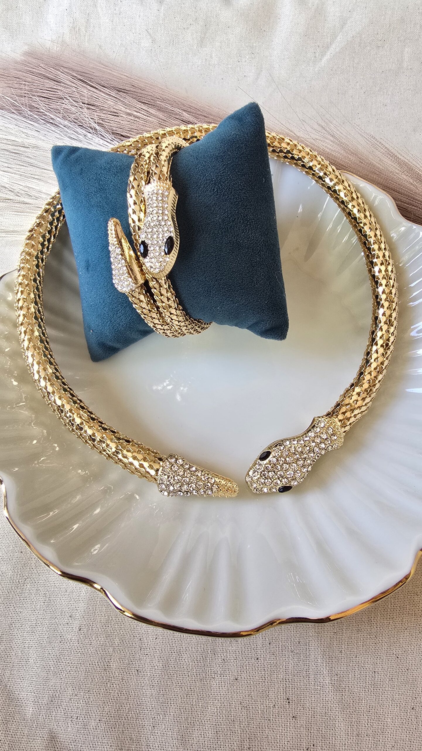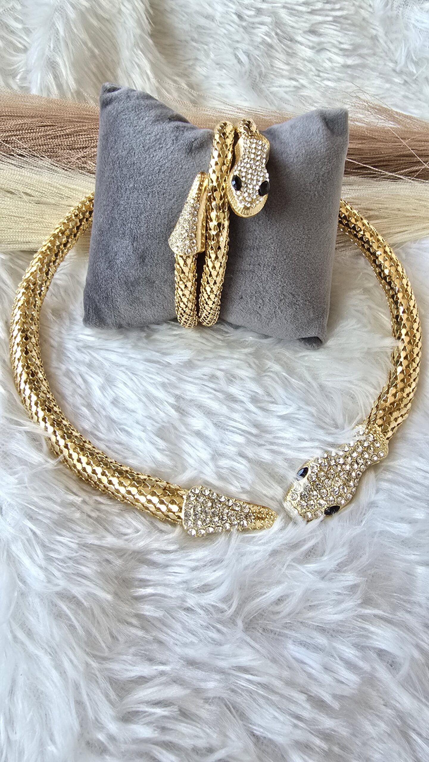 - The serpent heads are meticulously encrusted with shimmering rhinestones and striking black eyes.