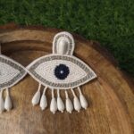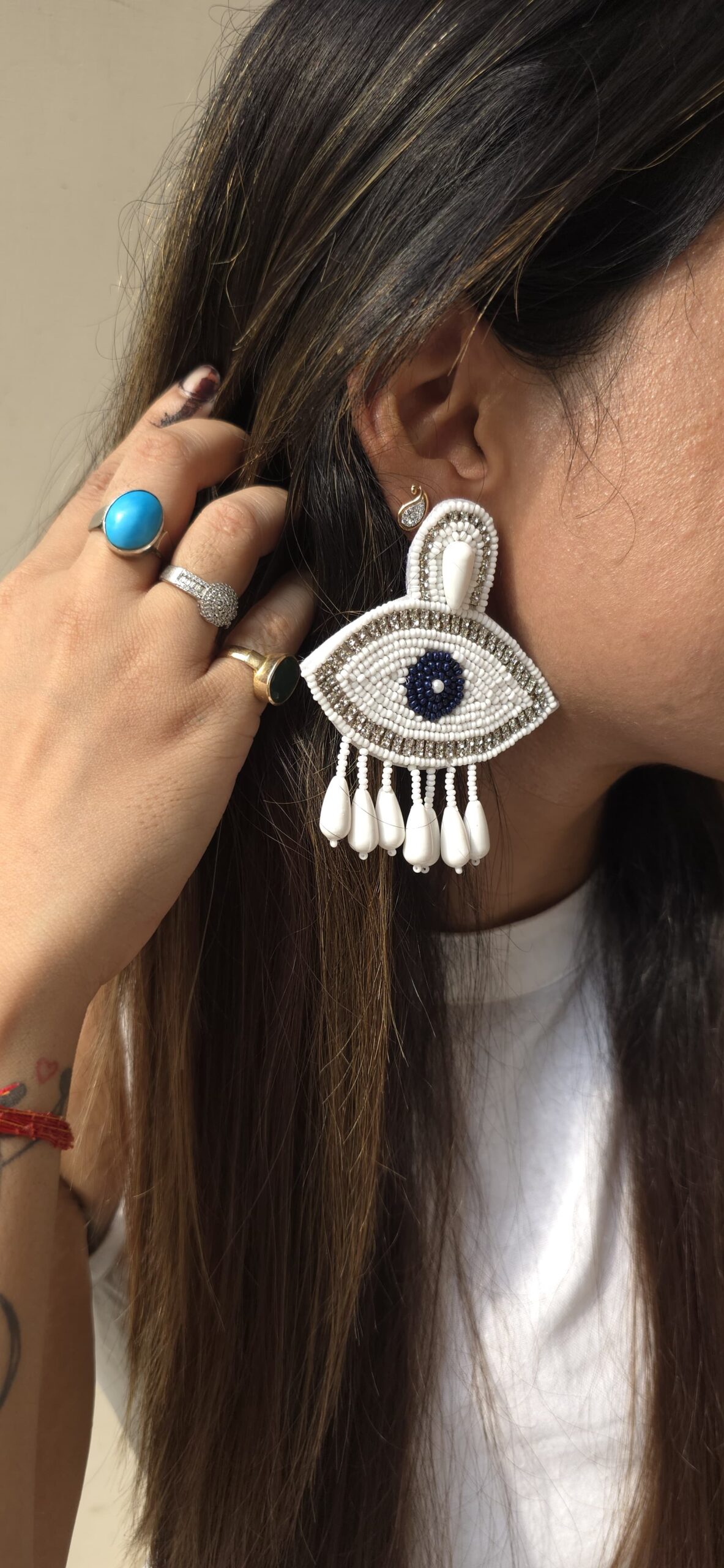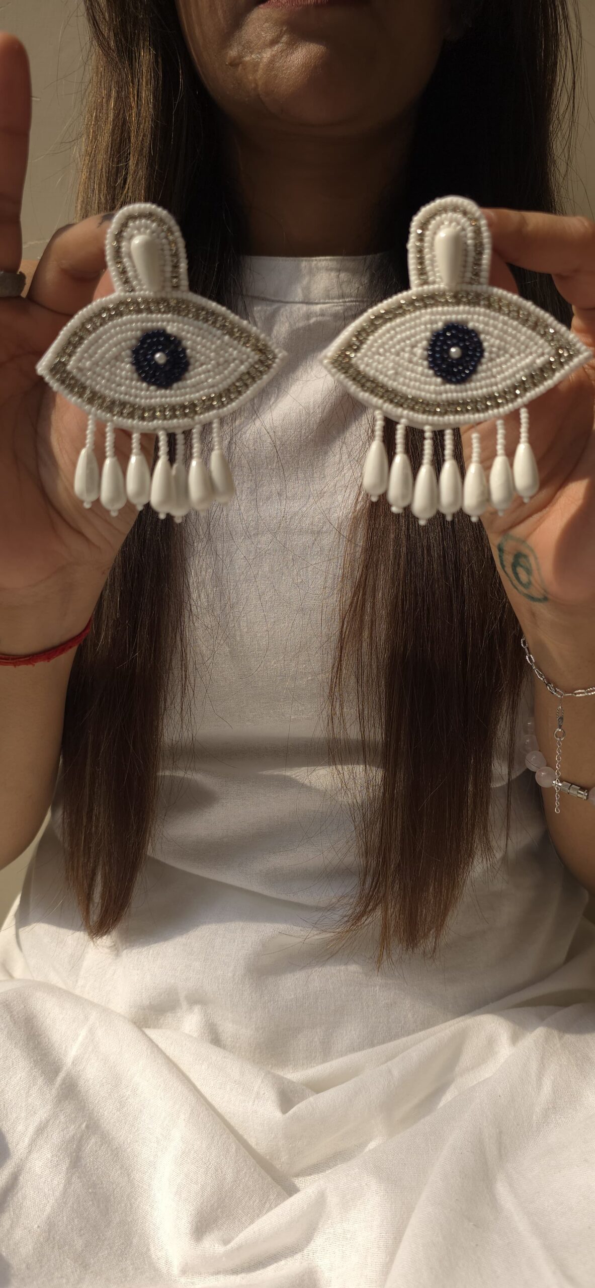 Unveil an aura of mystique and protection with our exquisite Mystic Gaze Beaded Evil Eye Earrings. These handcrafted statement earrings feature a meticulously beaded eye motif, rendered in elegant white or cream-colored beads, with a captivating deep blue (or black) pupil at its center. The outer rim is artfully outlined with shimmering silver or grey-toned beads, leading down to a cascade of delicate white drop beads that evoke the look of elegant eyelashes. Beyond their striking beauty, these “beaded eye” earrings are a modern interpretation of the ancient evil eye symbol, believed to guard against misfortune and bring good luck. Perfect for adding a bohemian chic touch or a conversation-starting element to any outfit, they are a unique blend of cultural symbolism and contemporary fashion.