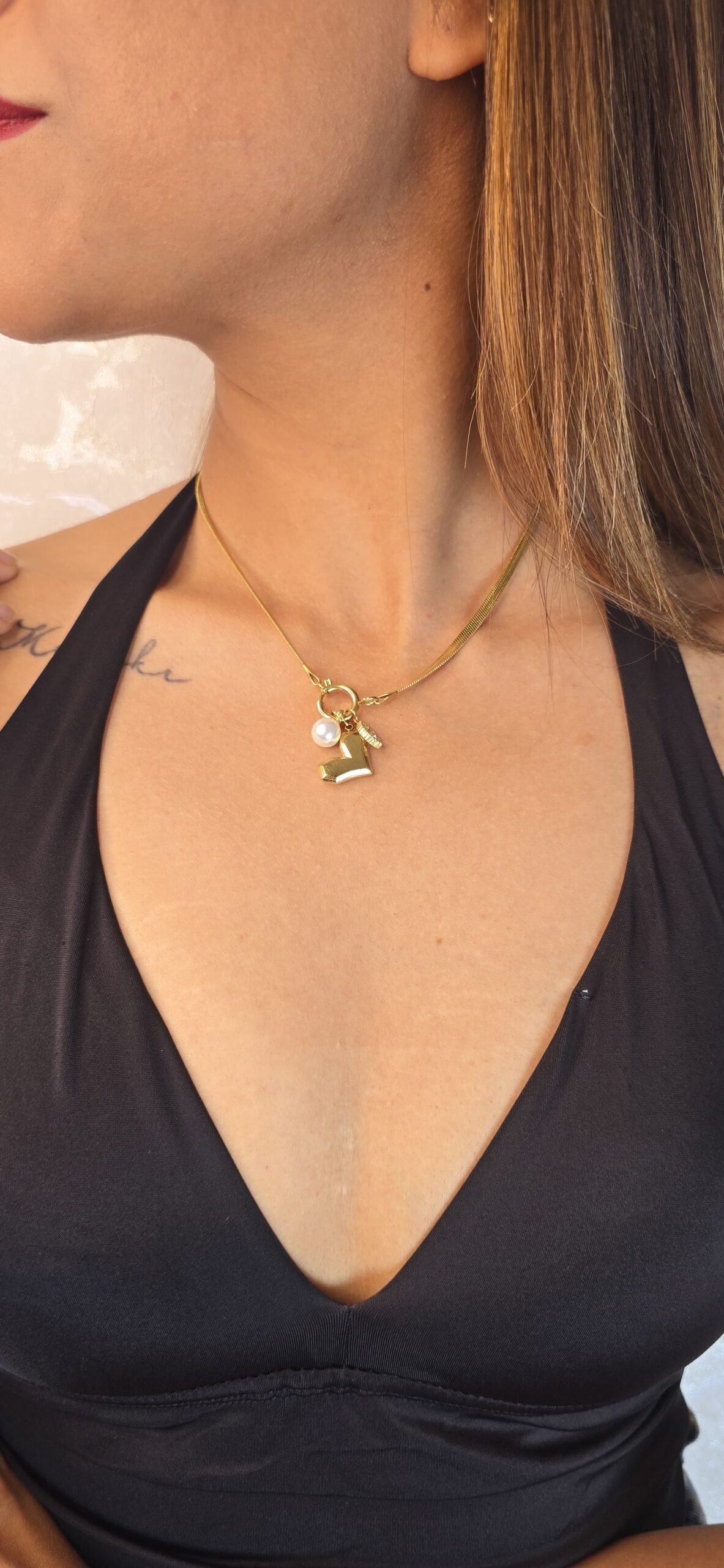 - Adorned with three distinct charms: initial, pearl, and geometric.