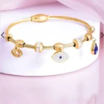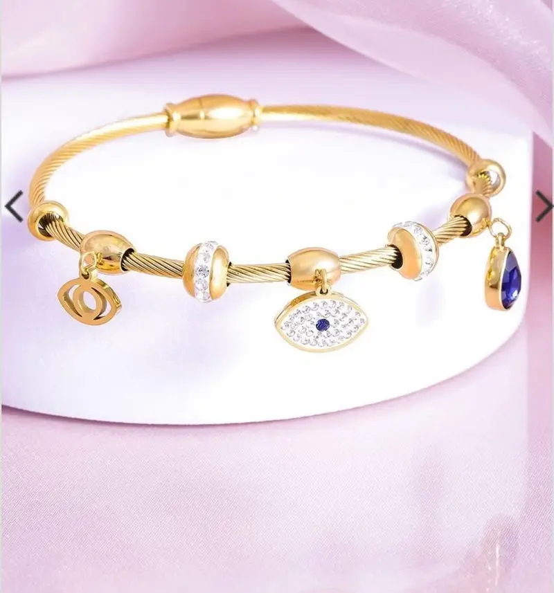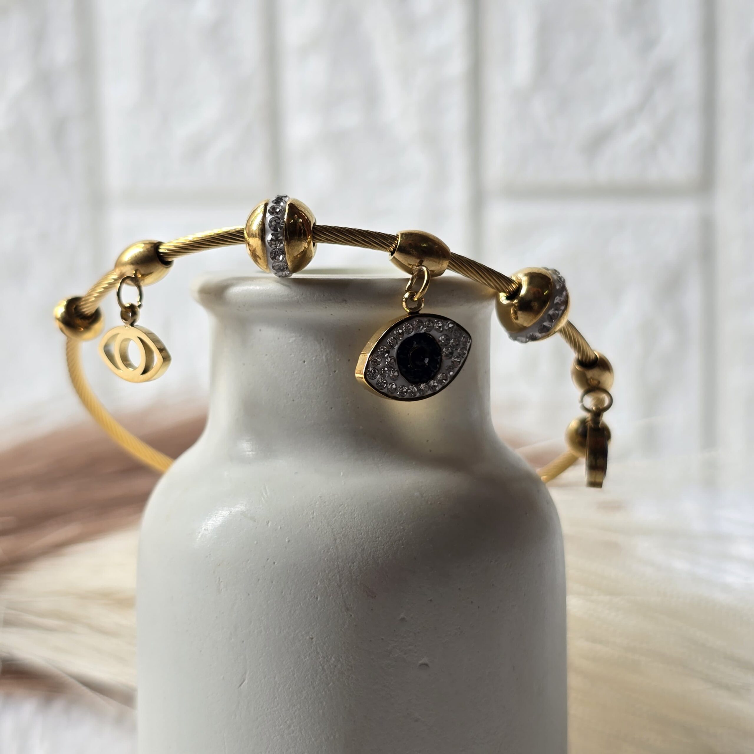 - Features a sleek gold-toned bangle adorned with a classic ‘evil eye’ charm and a vibrant blue teardrop charm.