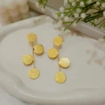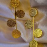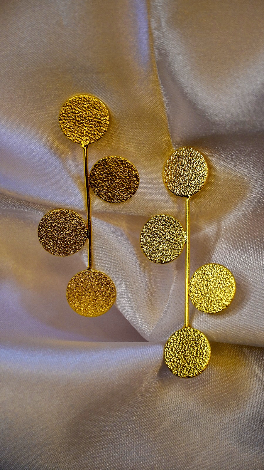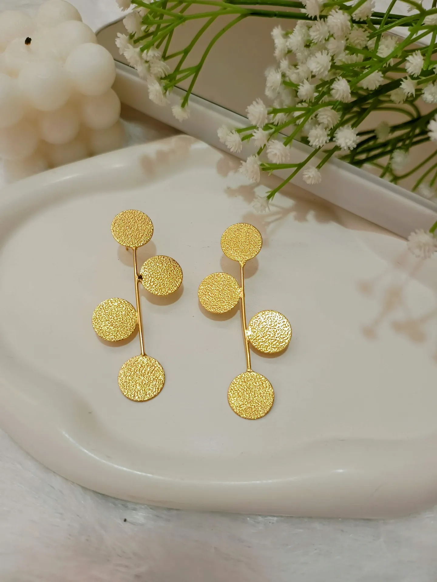 - Gold-toned drop earrings with a linear arrangement of textured discs.