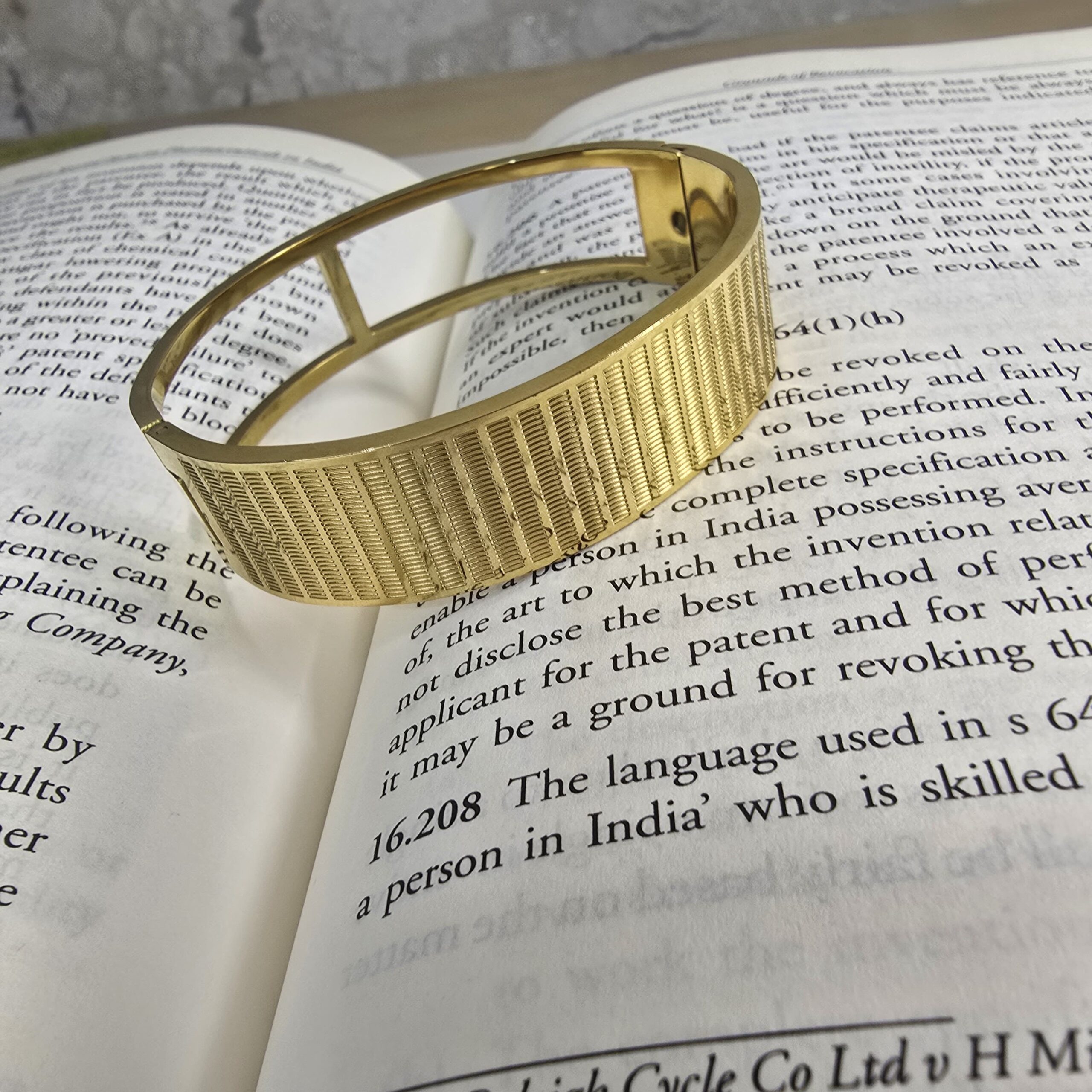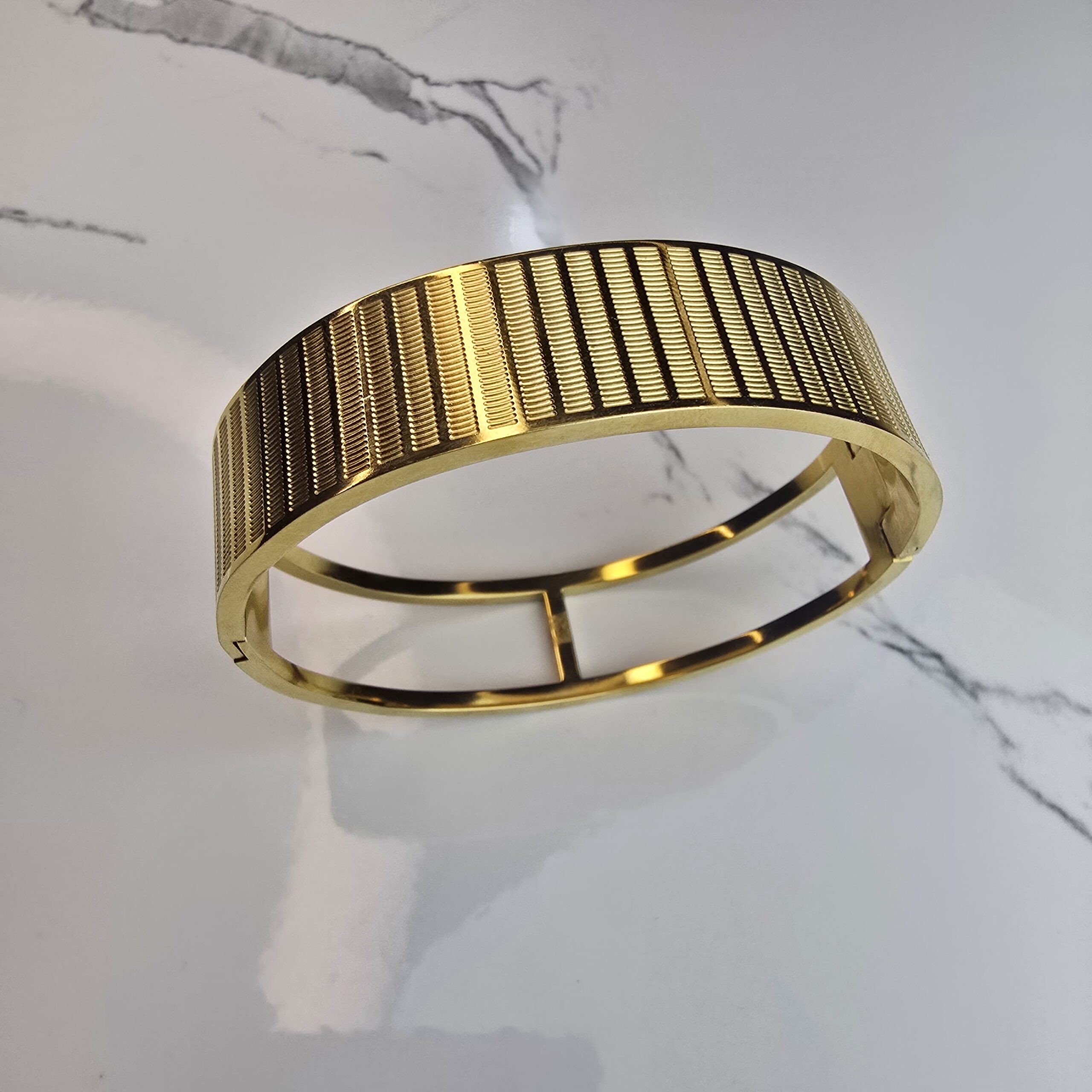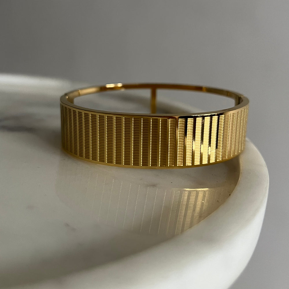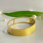 • Features a striking gold-toned wide band with a meticulously ribbed texture.