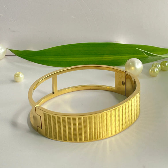 Embrace a sophisticated edge with the Golden Horizon Cuff. This enchanting bracelet showcases a brilliant gold-toned surface adorned with a subtle yet captivating linear texture, creating an intriguing play of light and shadow. The polished finish and structured form make this cuff a testament to refined craftsmanship. Its comfortable open design allows for ease of wear, making it a perfect choice for adding a touch of luminous sophistication and golden warmth to your collection. Key Selling Points Highlighted (with added features):