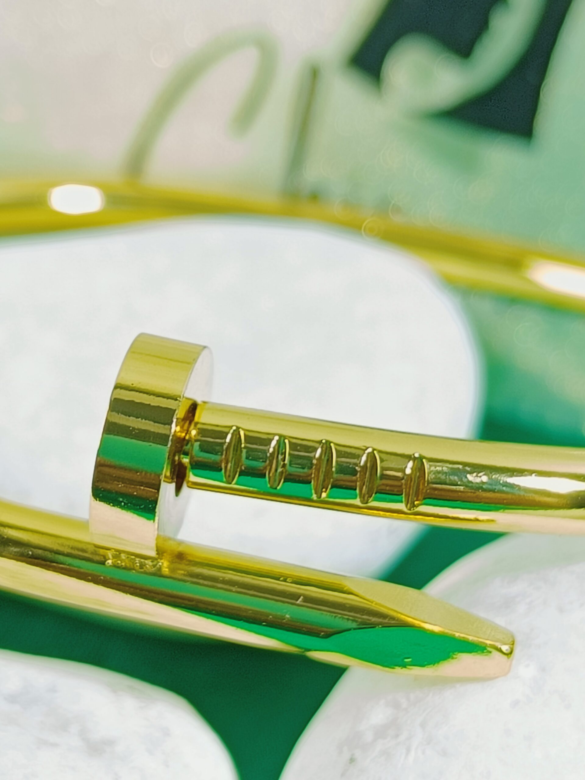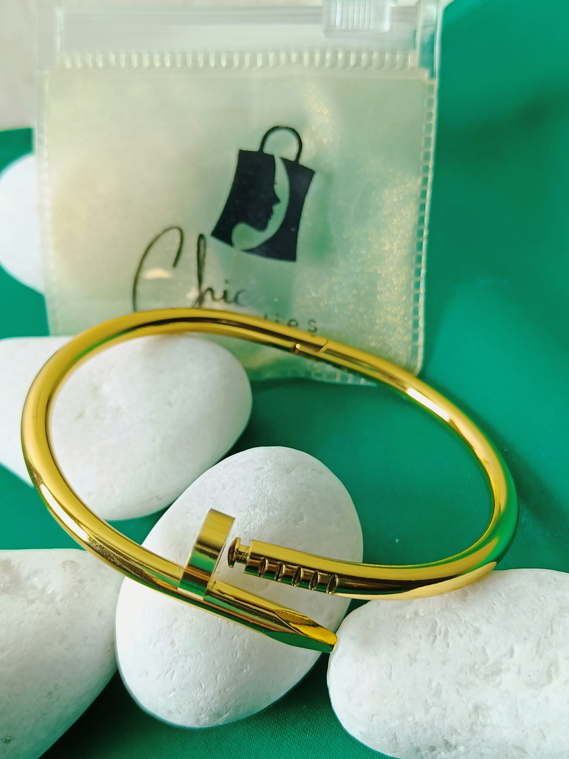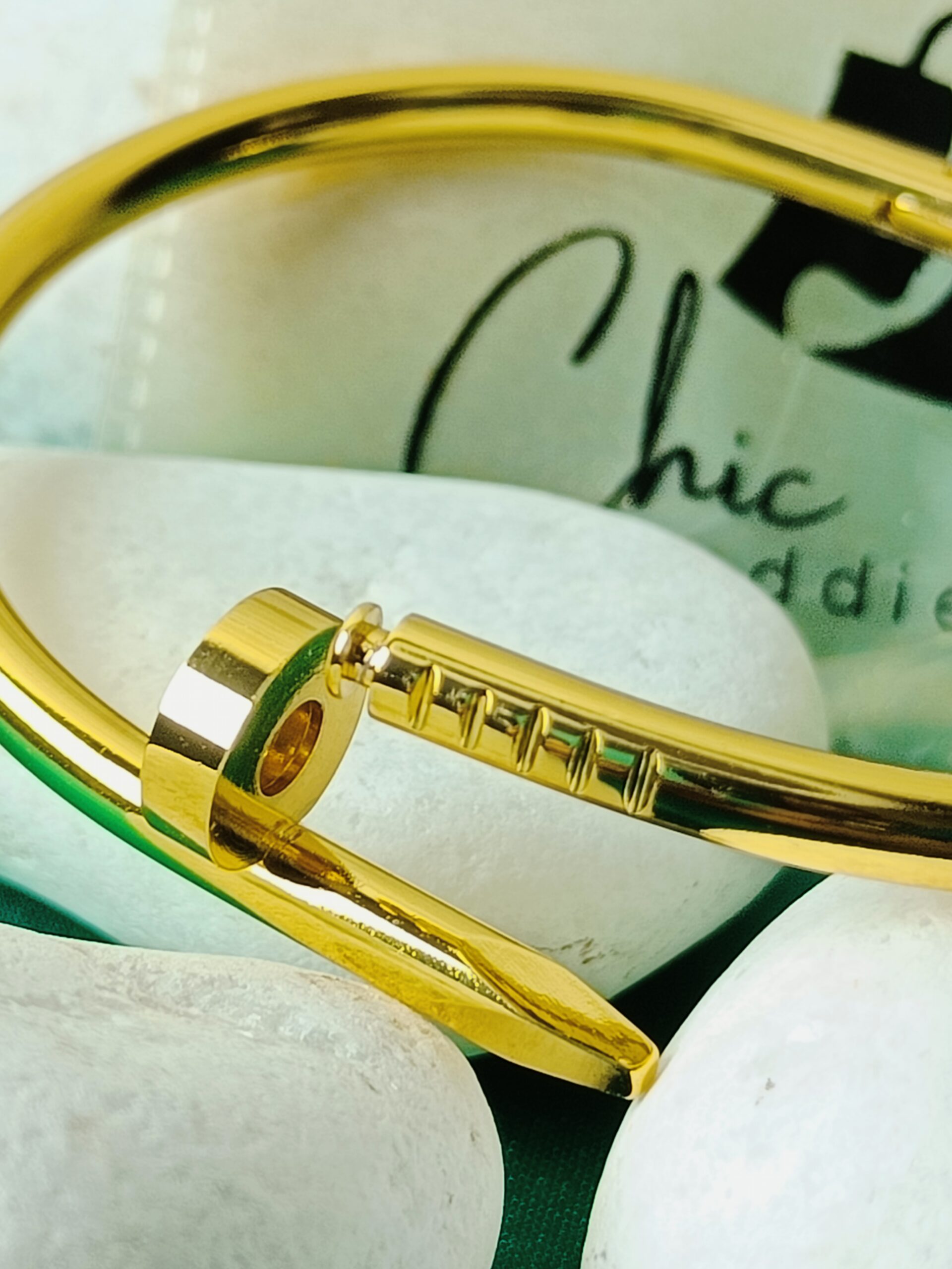 Make a bold and sophisticated statement with our Chic Nail Bangle. This exceptional “gold nail bracelet” reimagines a classic form with its distinctive nail-shaped design, offering a fusion of edgy appeal and refined elegance. Crafted in a radiant gold tone, its impeccably smooth and “polished” surface ensures a dazzling reflection of light, adding instant luxury to your wrist. This “thick gold bracelet” is more than just an accessory; it’s a conversation starter, perfect for the modern woman who embraces unique and high-fashion jewelry. Whether worn alone as a powerful statement or layered with other “gold bracelets for women”, the “Chic Nail Bangle” promises to elevate any ensemble with its distinctive charm and brilliant allure.