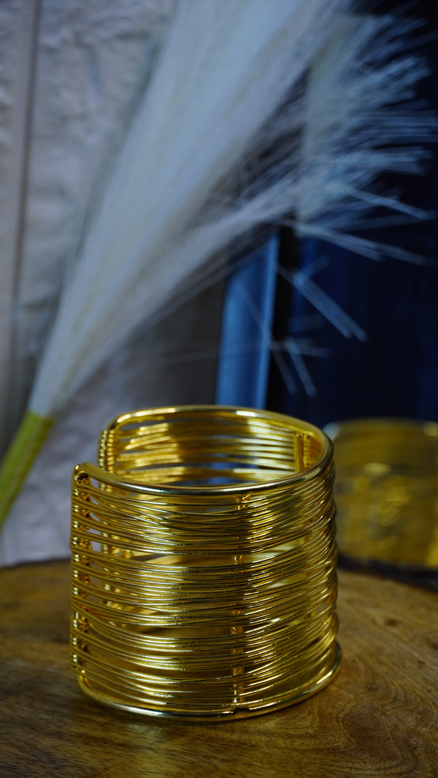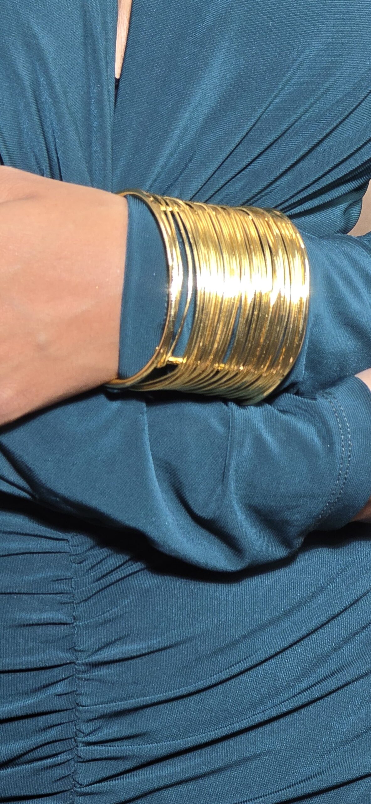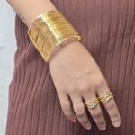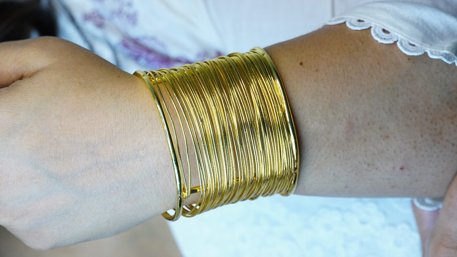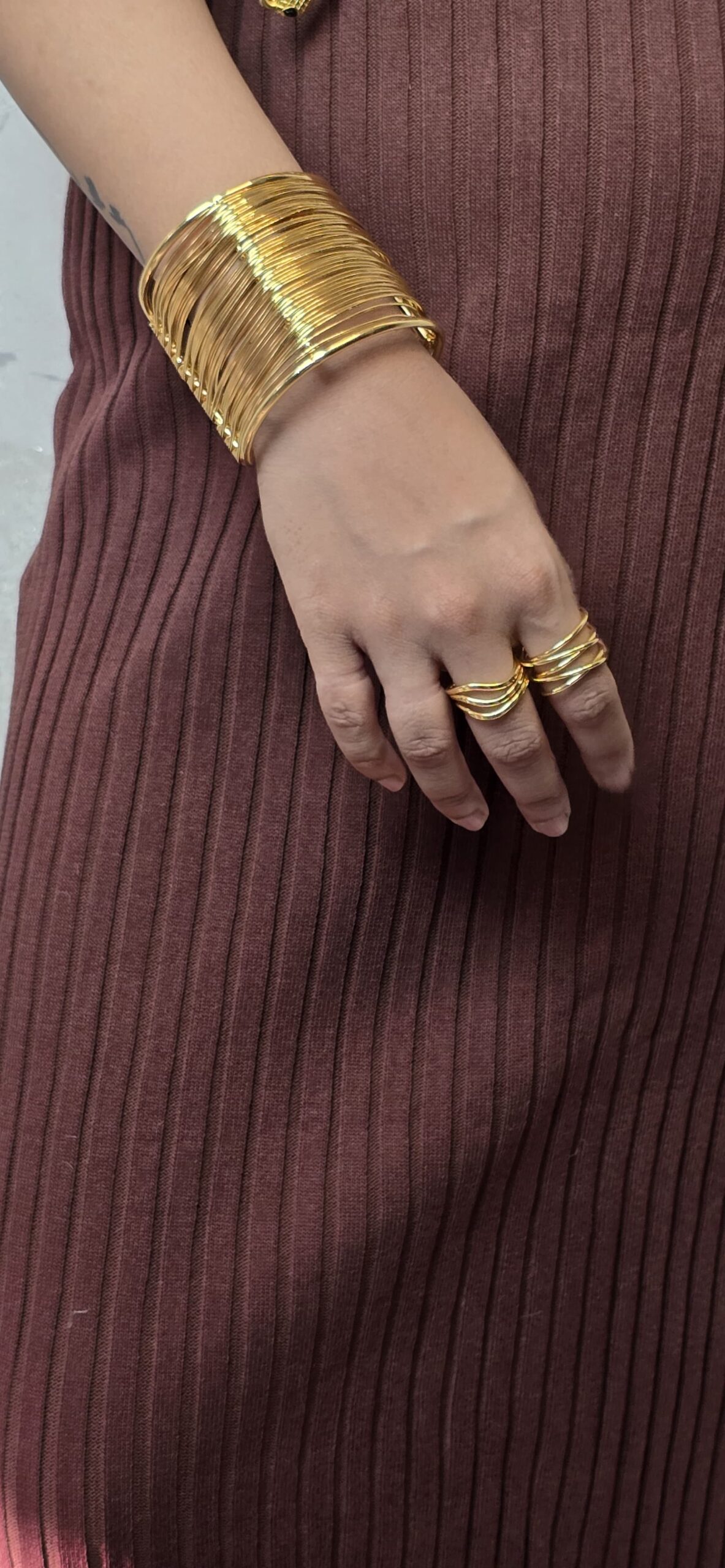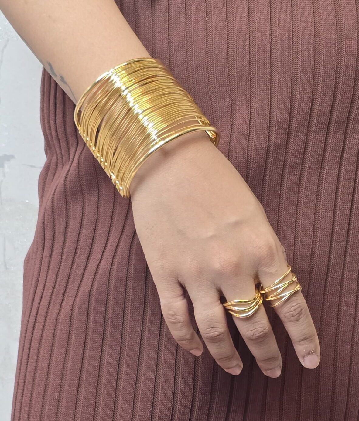 • Wide gold-toned cuff made of multiple thin wires.