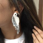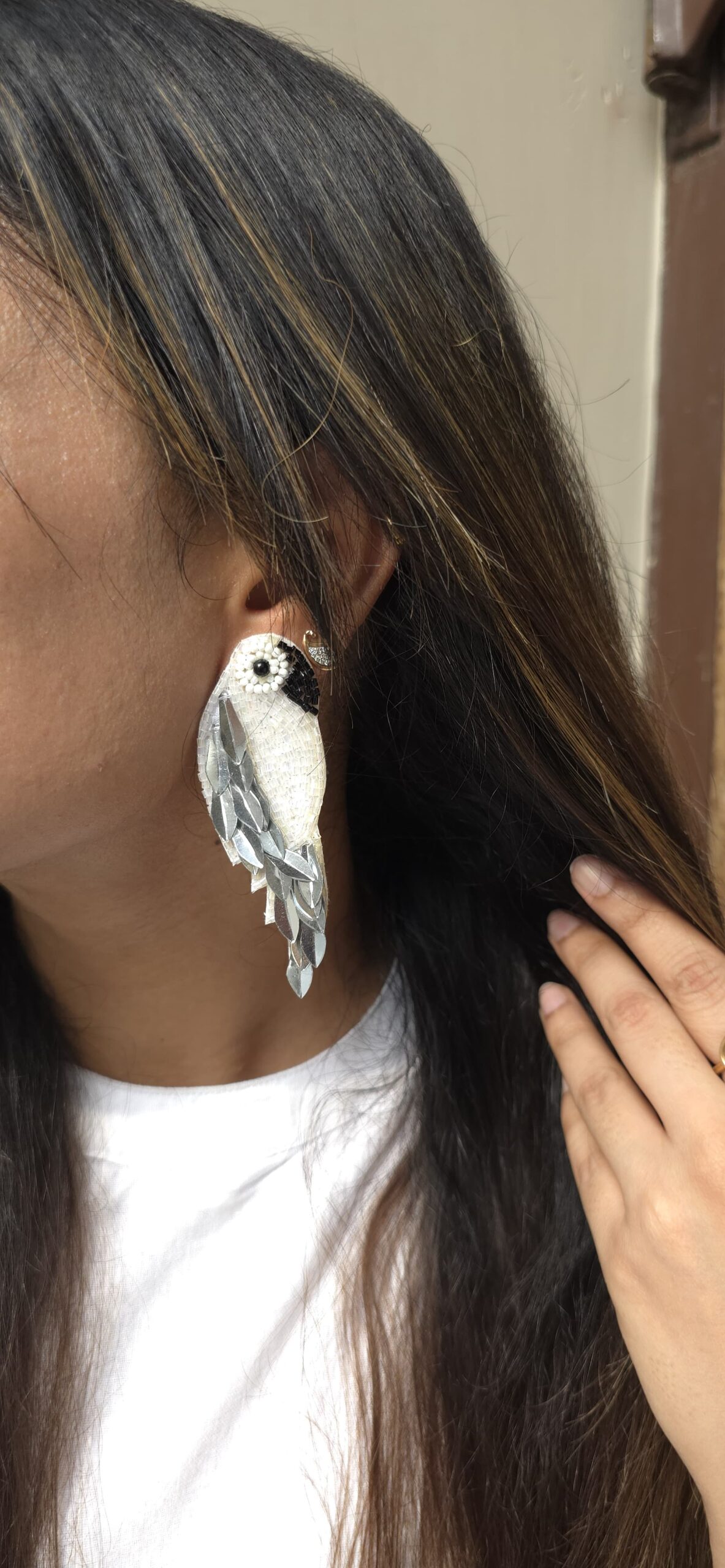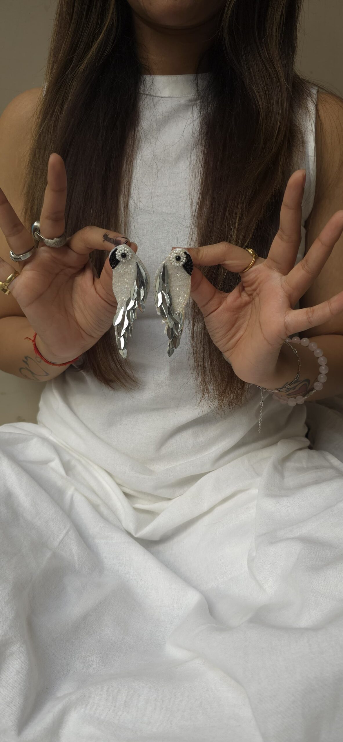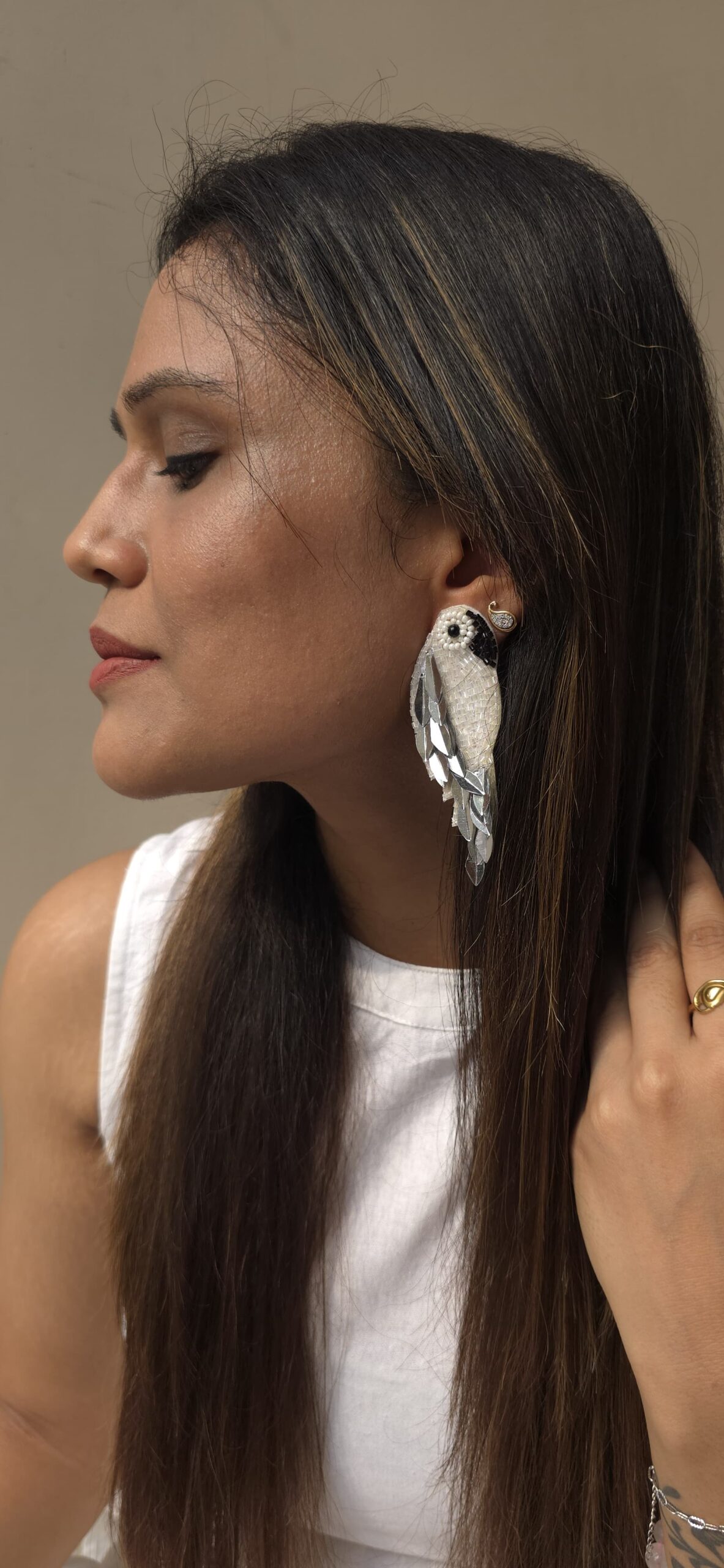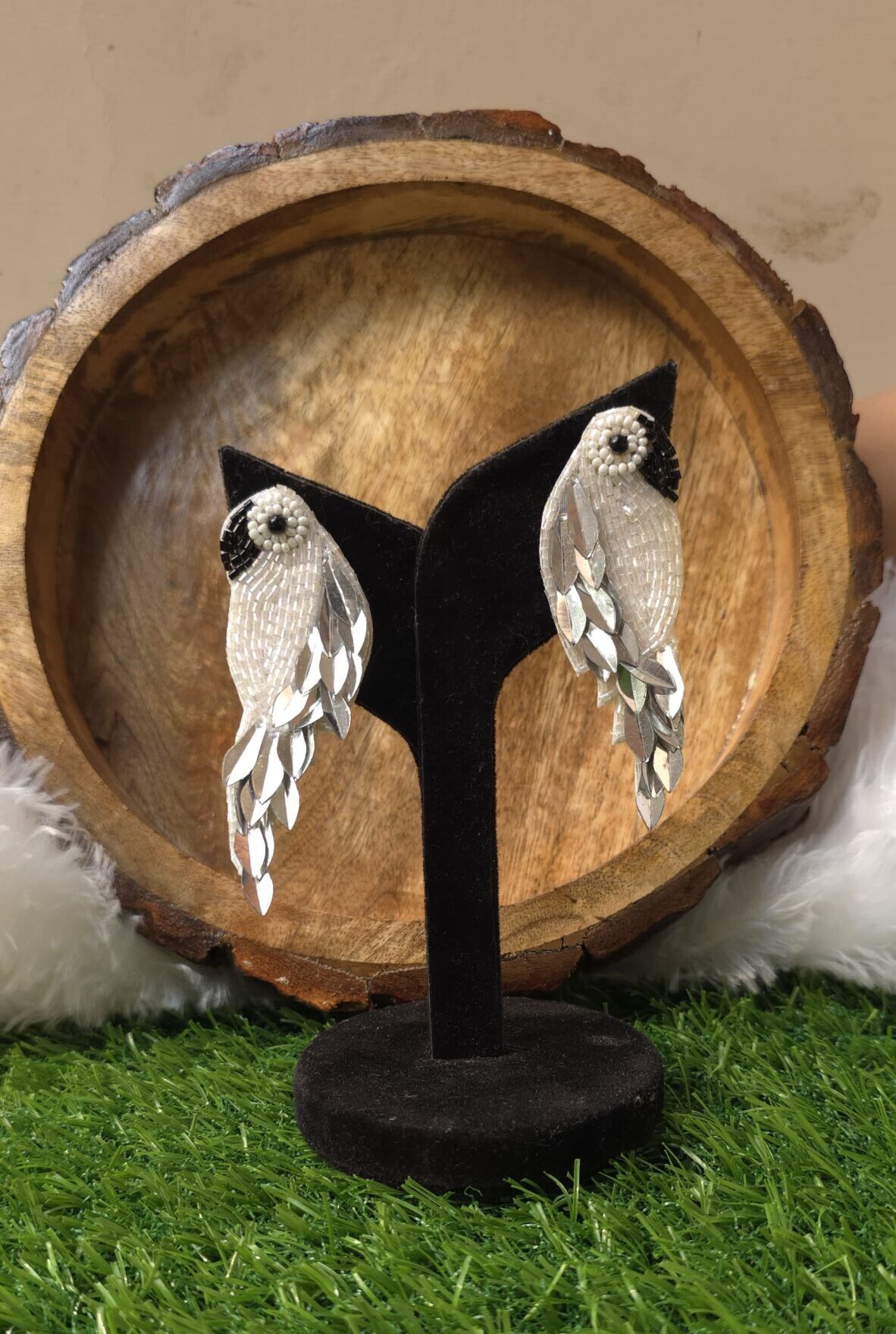 Soar into enchanting style with our Whimsical Flight Beaded Bird Earrings. These stunning statement earrings are a testament to artistic craftsmanship, featuring a meticulously beaded bird design in elegant white or silver tones, complemented by a bold black beaded head. Each earring is adorned with delicate, shimmering dangling elements that mimic the grace of feathers or leaves, adding beautiful movement and an iridescent glow. Inspired by “wood art birds”, these earrings are not just accessories but wearable art, perfect for those who appreciate unique and expressive jewelry. Whether for a special event or to elevate an everyday look, these “beaded bird earrings” promise to be a captivating conversation starter.