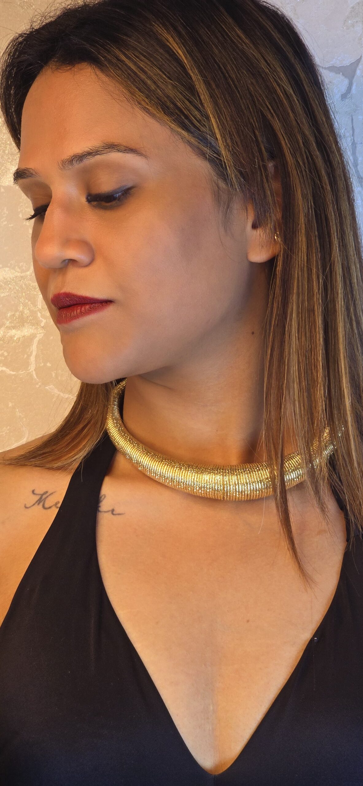 Imagine slipping this on and feeling a touch of old-world glamour. This isn’t just a necklace, it’s a statement piece. The brushed gold finish gives it a warm, inviting glow, and the intricate texture adds a touch of mystery. You’ll love the way it catches the light and makes you feel like a million bucks. Whether you’re dressing up for a special occasion or adding a touch of elegance to your everyday look, this Hansli necklace is sure to turn heads.